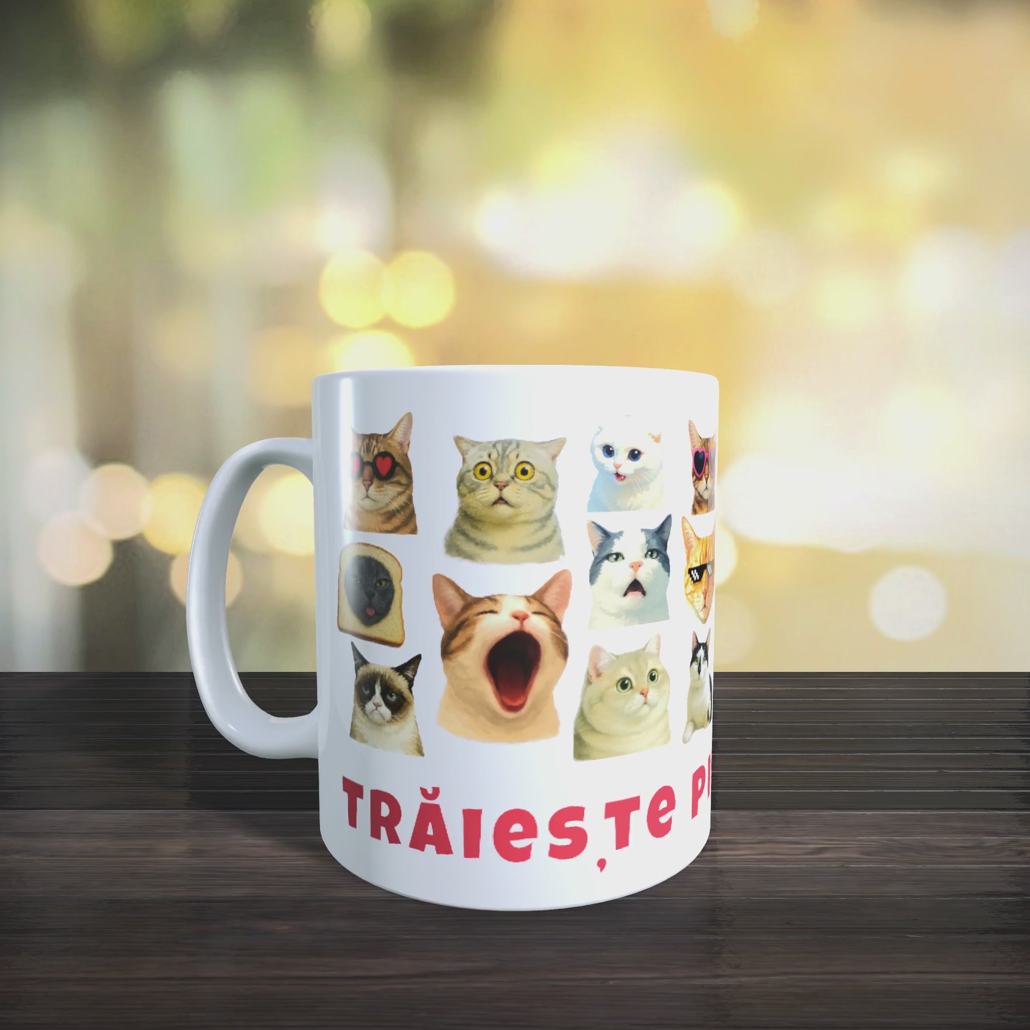 „Trăiește pisi-momentul” e o cană plină de energie pozitivă, cu cele mai expresive fețe de pisici – adorabilă, amuzantă și perfectă pentru cadou.